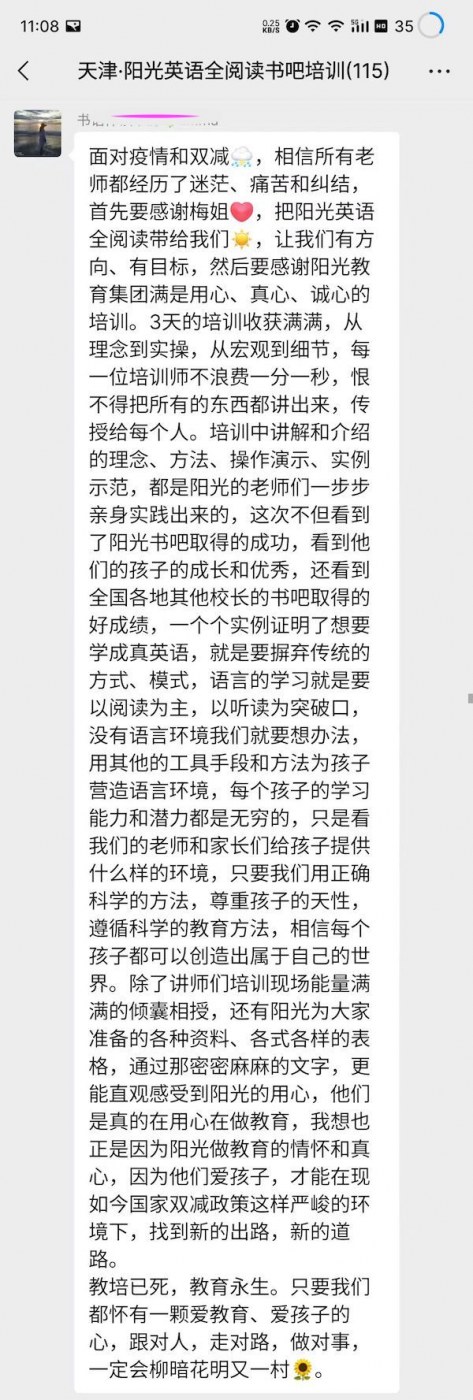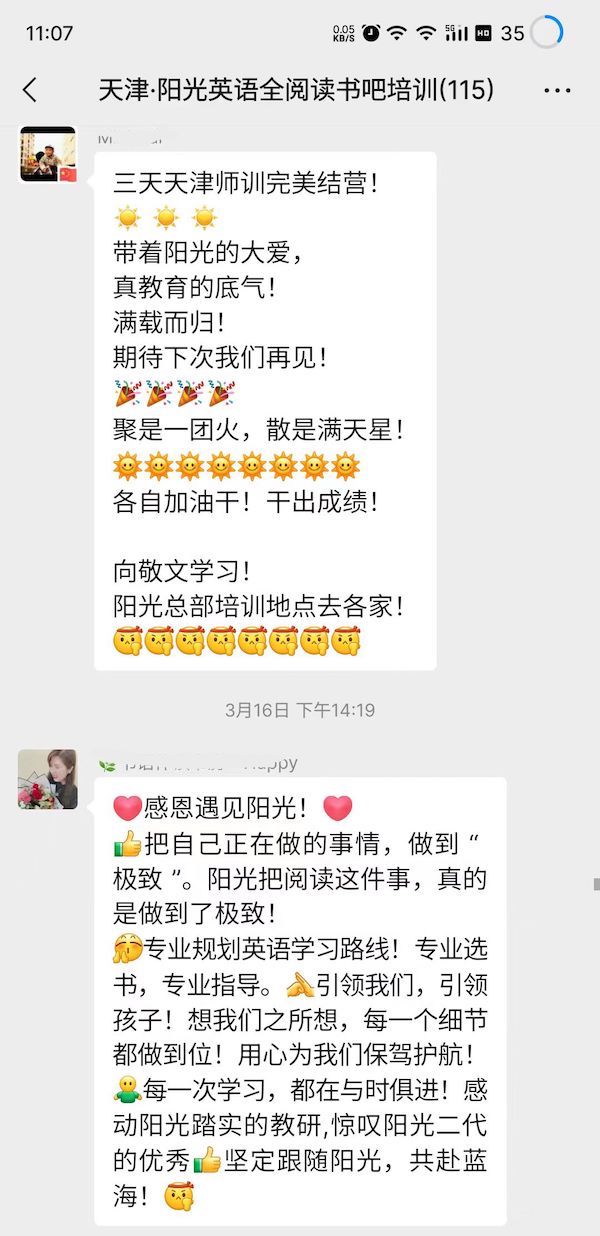 陽光書吧指導(dǎo)師集訓(xùn)營全程干貨滿滿,從理論到實(shí)操,到現(xiàn)場(chǎng)觀摩天津敬文書苑,加之天津敬文書店唐館長及西安格致書吧賈館長的書吧升級(jí)經(jīng)驗(yàn)及成果分享,讓全體與會(huì)者看到了一個(gè)實(shí)實(shí)在在的合法合規(guī)的能學(xué)成真英語的書吧,與會(huì)者高度認(rèn)可陽光英語全閱讀書吧模式。